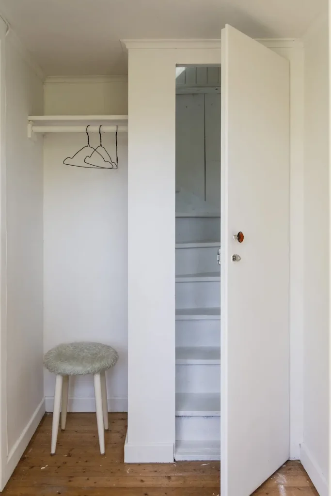 The living room features a traditional Swedish tiled fireplace. A hidden staircase leads to a charming sleeping loft with white-painted floorboards and white walls.