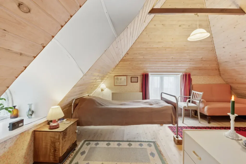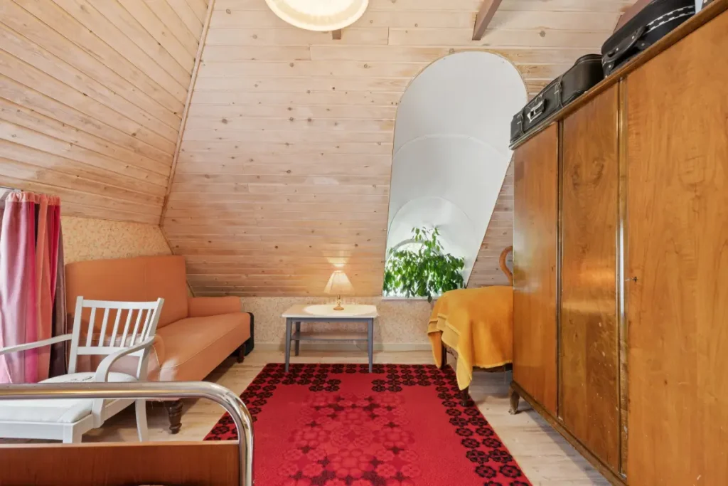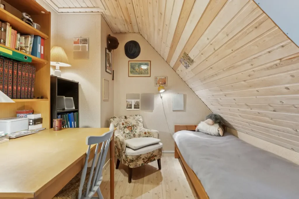 Upstairs, a small landing leads to two well-sized bedrooms and a storage room. The master bedroom is a spacious room with high ceilings.